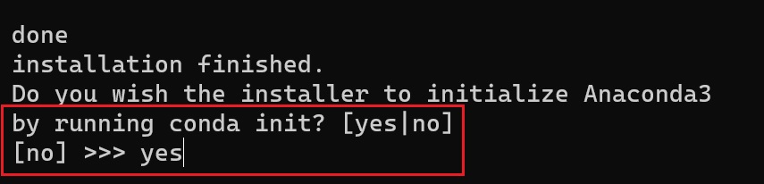 - by running conda init [yes|no] [no] >>> : 이 텍스트가 나오면 yes를 입력합니다.