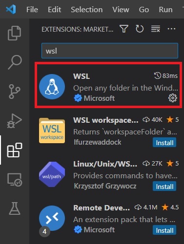 - VSCode에서 좌측에 Market을 들어가 wsl과 python을 설치합니다.