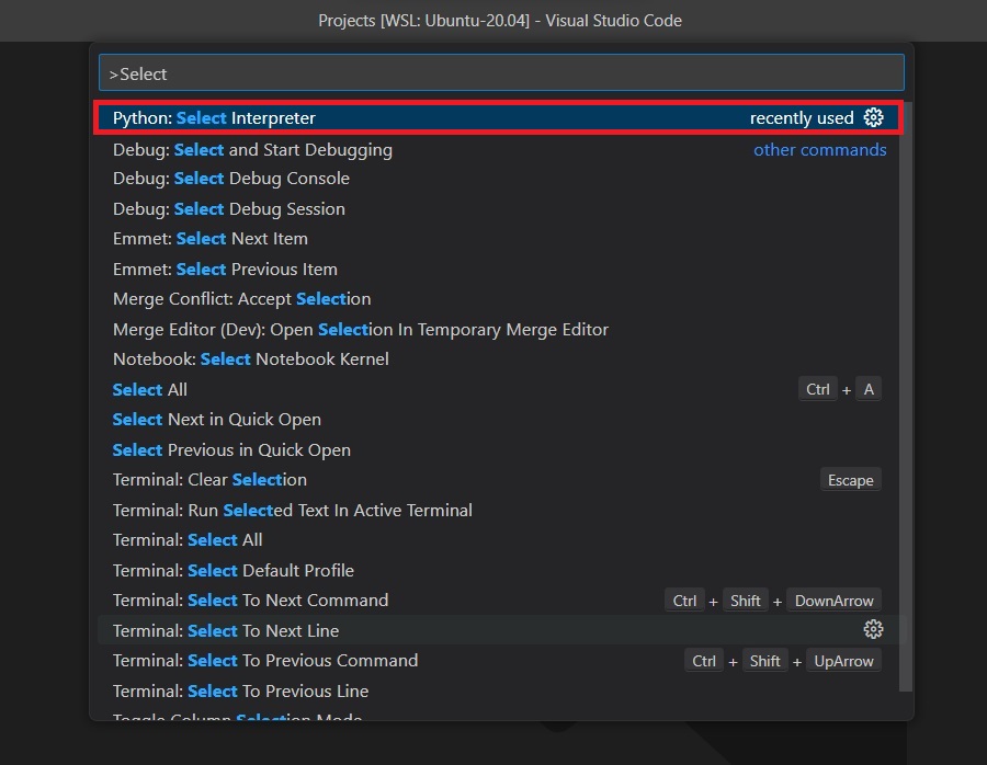- 마찬가지로 Ctrl+Shift+P를 누르고 WSL을 입력합니다. 이후 Python: Select Interpreter를 선택하고 Anaconda에서 생성한 가상환경을 Interpreter로 설정합니다.