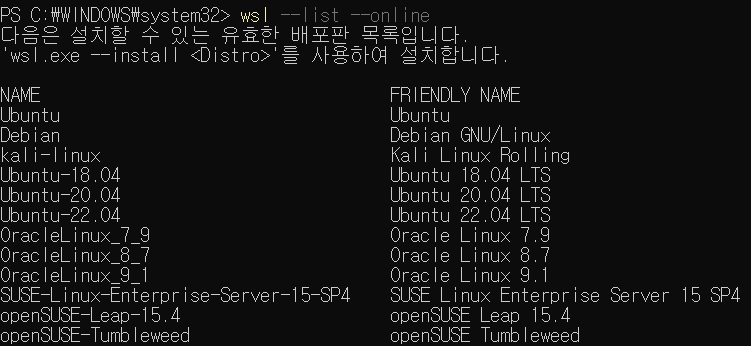 - Ubuntu 대신 다른 리눅스 배포판을 받고 싶으시면 아래 명령어로 확인 가능합니다.