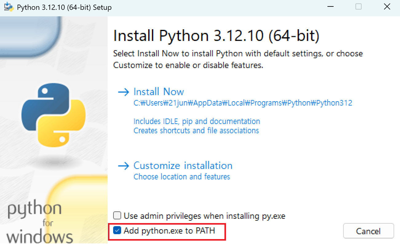 * 설치 시 아래와 같이 Add python.exe to PATH에 체크를 해주어야 cmd에서 경로 입력없이 python을 호출할 수 있음.
