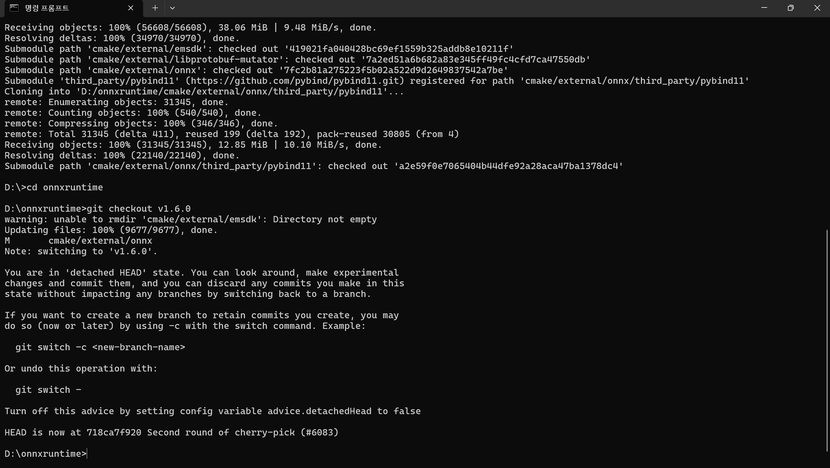 세팅이 끝났으면 아래와 같이 onnxruntime 소스를 깃 저장소로부터 가져온다. 용량이 커서 시간이 다소 걸린다.