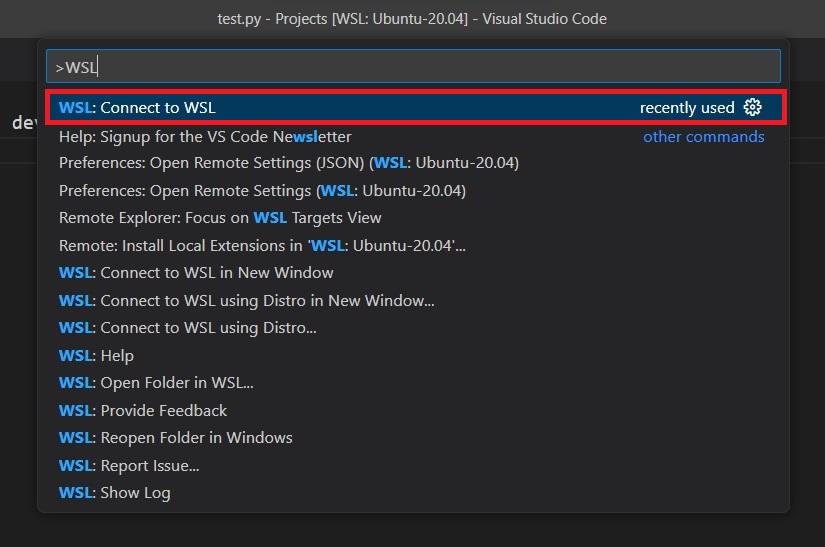 • Ctrl+Shift+P를 누르고 WSL을 입력합니다. 이후 WSL: Connect to WSL을 누르면 자동으로 WSL으로 이동합니다.