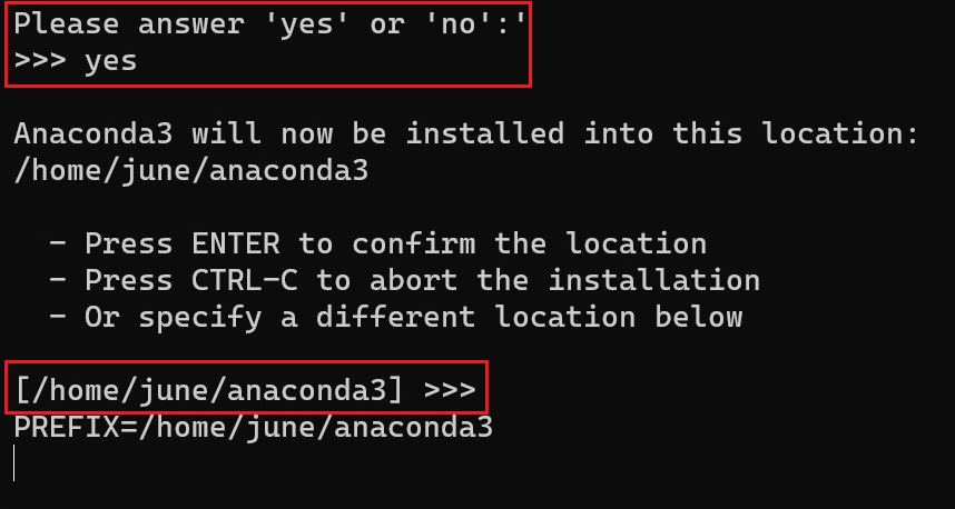 • /home/june/anaconda3/은 앞에서 anaconda 설치 시 입력한 PREFIX 값입니다.