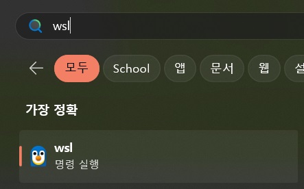 • WSL 실행 방법은 검색창에 wsl을 입력해서 wsl 앱을 통해 들어갈 수 있으며, Windows PowerShell에서 wsl 입력하면 들어갈 수 있습니다.
