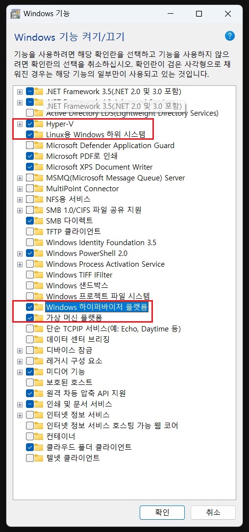 • Hyper-V / Linux용 Windows 하위 시스템 / Windows 하이퍼바이저 플랫폼 / 가상 머신 플랫폼