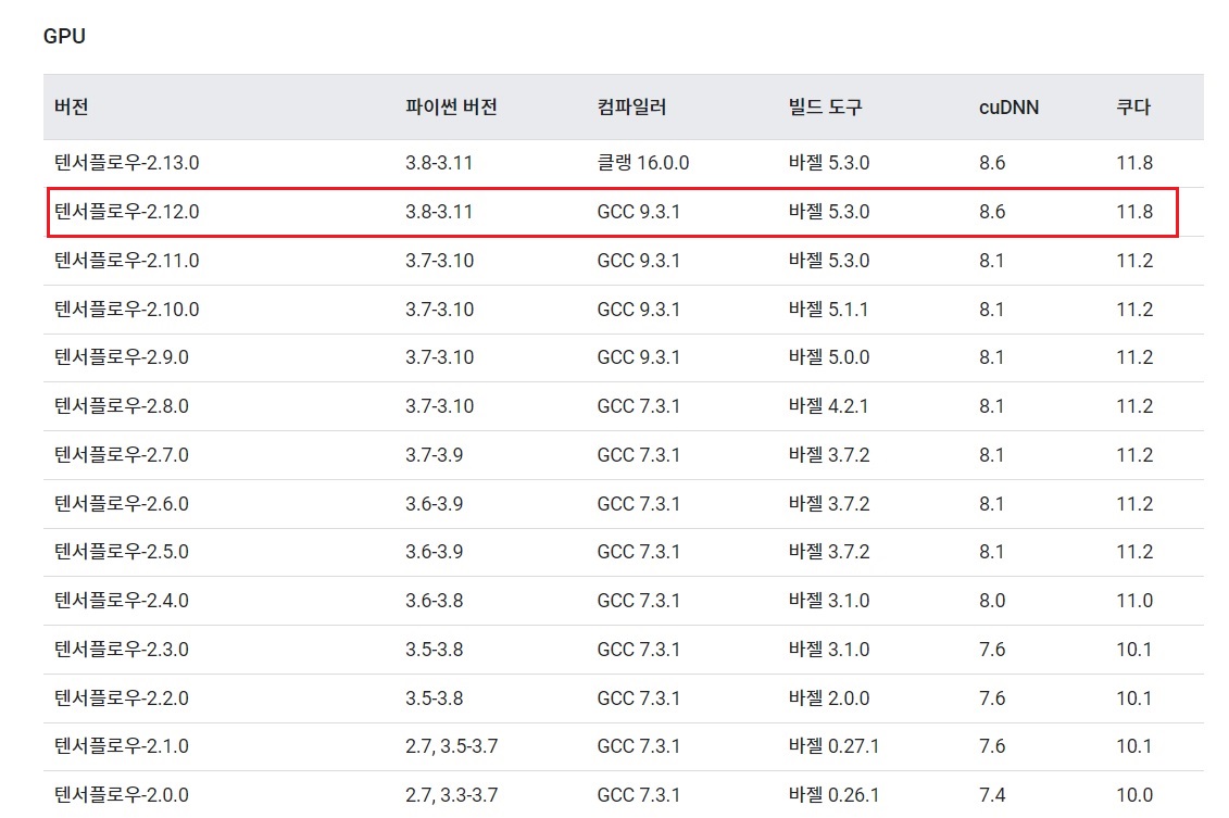 • 설치 하기 전에 Tensorflow 버전에 따른 CUDA, cuDNN 호환 버전을 확인해야합니다. 아래 사이트를 들어가면 자세히 나와있습니다.